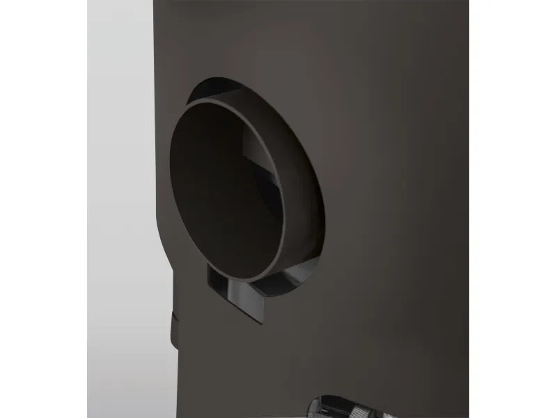 Die Scheibenspülung, die einen Luftstrom entlang der Geraden Scheibe führt und diese dadurch aufheizt, sorgt dafür, dass sich weniger Ruß auf der Scheibe ablagert, die Sicht auf die Flammen somit stets frei bleibt und das Sichtfenster seltener gereinigt werden muss. Die Form der Scheibe unterstützt das geradlinige Design des Kamins.