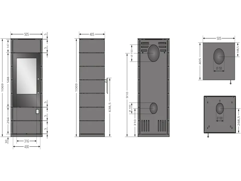 Der Wohnzimmerkamin erzeugt pro Sekunde 6 g Abgase, die mit einem Förderdruck von mindestens 0,12 mbar über den Schornstein abgeleitet werden müssen. Die Staubemission liegt bei 27 mg/m³. Die möglichen Anschlüsse für das Rauchrohr befinden sich oben und hinten und haben einen Durchmesser von 150 mm. Aus Sicherheitsgründen muss von der Sichtscheibe aus ein Mindestabstand von 8 cm zu brennbaren Gegenständen wie Möbeln oder Teppichen eingehalten werden. Zur Seite und nach hinten muss der Kaminofen mindestens 2 cm entfernt von anfälligen baulichen Elementen und brennbaren Gegenständen platziert sein. Für detaillierte Informationen bezüglich der Installation und der generellen Voraussetzungen zur Verwendung eines Kaminofens konsultiere bitte einen Fachmann.